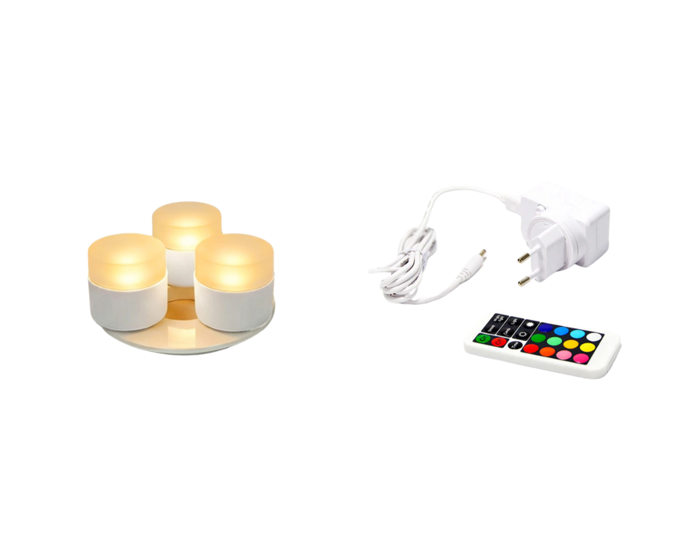 Our LED battery-powered lights come in a set of three with an induction charging station and a remote control.