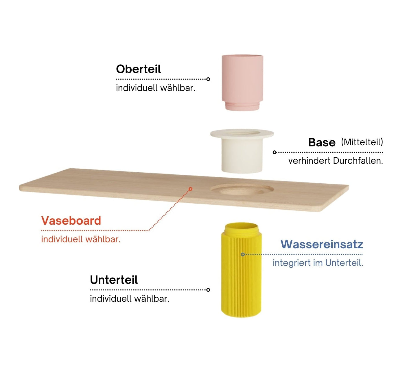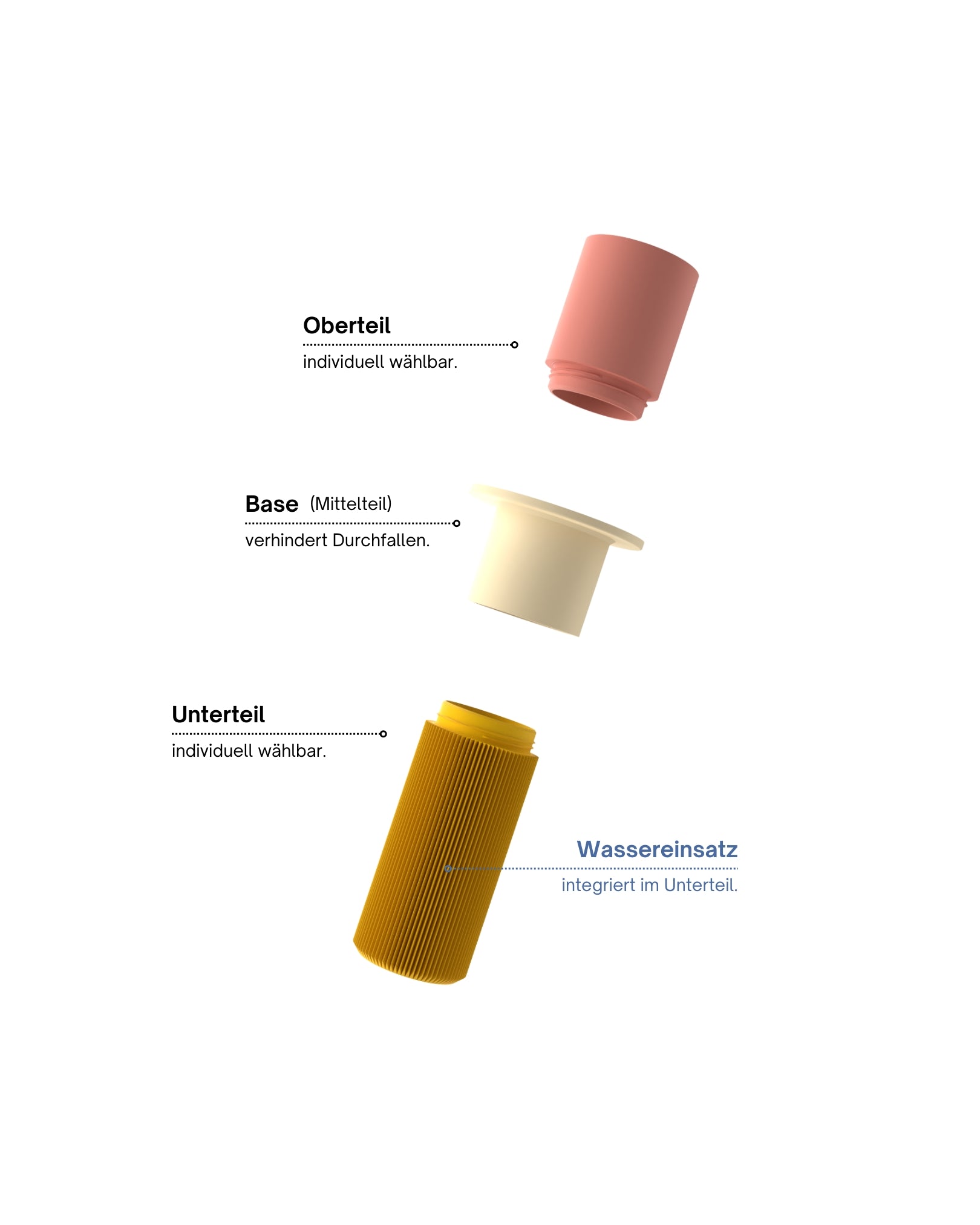 Jede Vase besteht aus drei passgenauen Einzelteilen, die einfach zusammengeschraubt werden. So ist der Aufbau besonders stabil, leicht zu reinigen und flexibel erweiterbar.