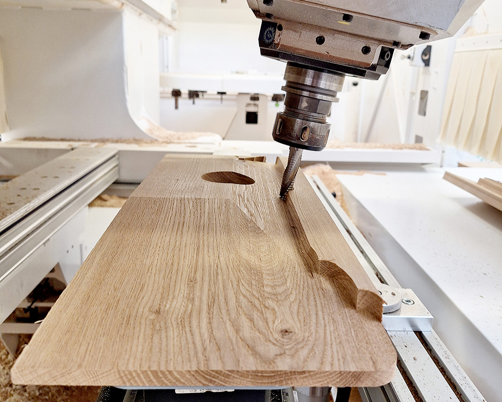 Das filigrane Regalbrett aus massivem Eichenholz wirkt durch seine umlaufende Abschrägung besonders leicht und schwebend. Diese Abschrägung an allen Seiten erreichen wir dank modernster CNC-Technologie.